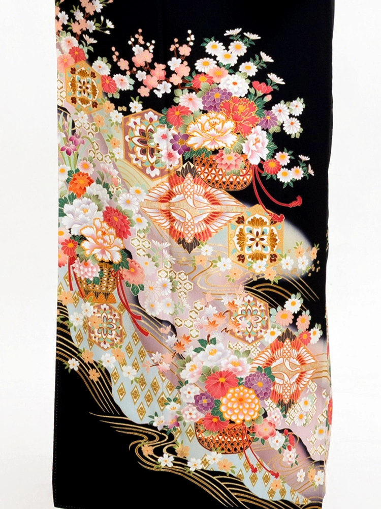格式ある黒地に、吉祥文様の宝尽くしと華やかな花々が豪華にあしらわれた黒留袖です。桜、牡丹、菊などの花が繊細に描かれ、金彩が全体に気品を添えています。