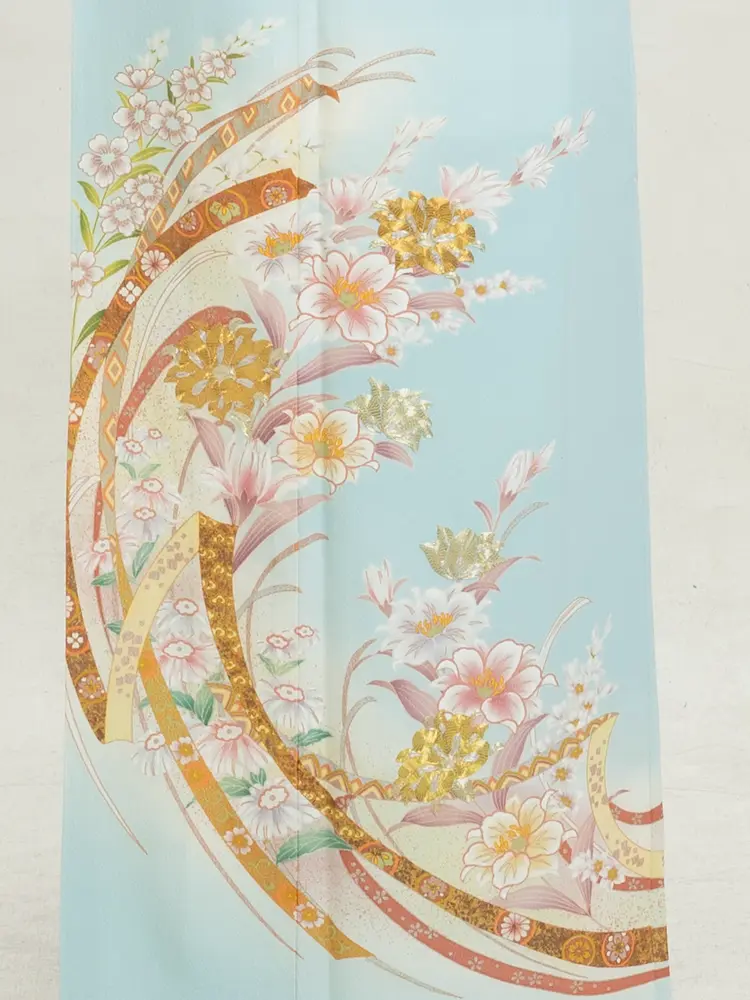 爽やかな水色の地に、流水文様と華やかな花々が美しく描かれた色留袖です。 流れるような構図が動きを感じさせ、優雅で涼やかな印象を演出します。 春夏のフォーマルな場にぴったりの一着で、結婚式や祝賀行事などに最適です。